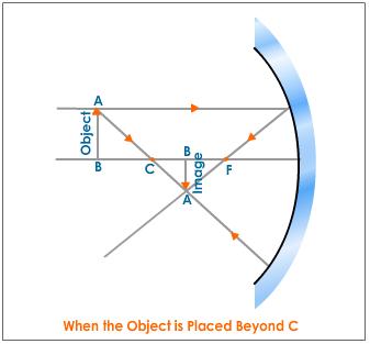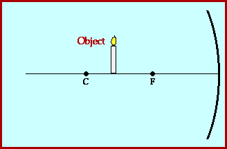 ب) وقتی جسم بین کانون و مرکز آینه باشدتصویر (حقیقی ،وارونه ،کوچکتر از جسم و در جلوی آینه دورتر از مرکز )ایجاد می شود